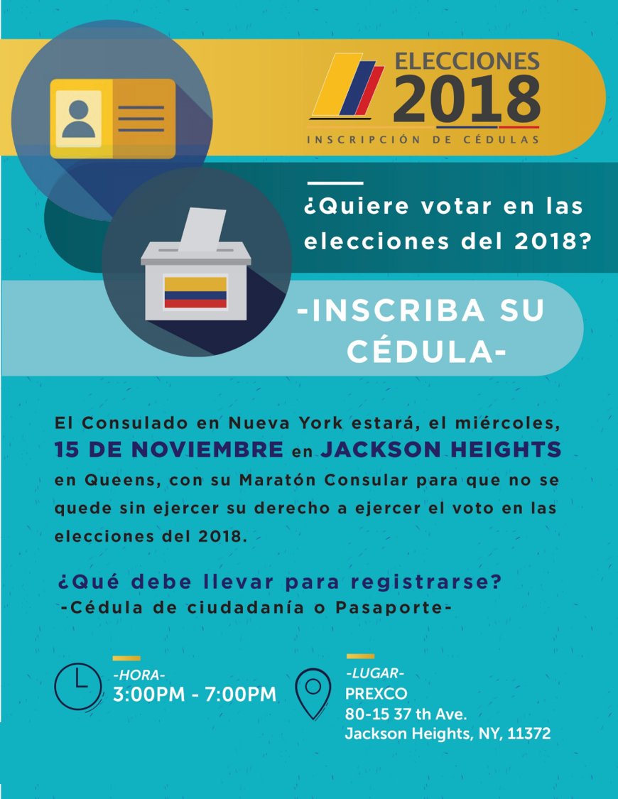 ¿Quiere votar desde el exterior en las elecciones de 2018? Inscriba su cédula. Consulado en Nueva York estará en Queens el miércoles, 15 de noviembre, realizando una jornada de inscripción de cédulaspic.twitter.com/PNvZYkGfMX