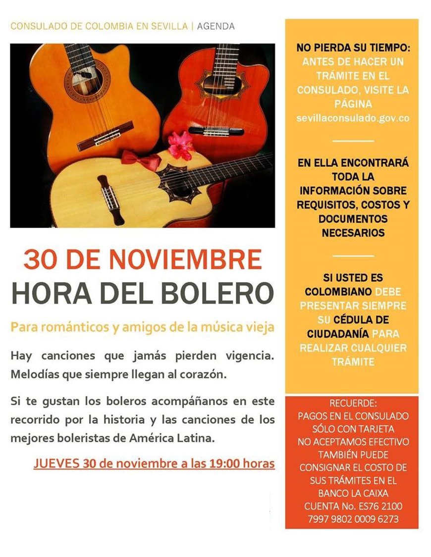 El 30 de noviembre llega "la hora del bolero" al Consulado de Colombia en Sevilla http://sevilla.consulado.gov.co/newsroom/news/2017-11-08/15181 …pic.twitter.com/60Yvk03jLC