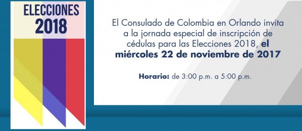 El Consulado de Colombia en Orlando invita a la jornada especial de inscripción de cédulas para las Elecciones 2018, el miércoles 22 de noviembre de 2017 http://orlando.consulado.gov.co/node/news/15239/consulado-colombia-orlando-invita-la-jornada-especial-inscripcion-cedulas-las …pic.twitter.com/OQnKgpIjby
