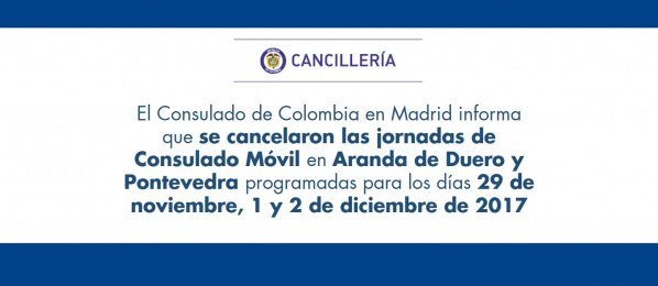 El Consulado de Colombia en Madrid informa que se cancelaron las jornadas de Consulado Móvil en Aranda de Duero y Pontevedra programadas para los días 29 de noviembre, 1 y 2 de diciembre de 2017 http://madrid.consulado.gov.co/node/news/15294/consulado-colombia-madrid-informa-que-se-cancelaron-las-jornadas-consulado-movil …pic.twitter.com/ViQVDJfOcX