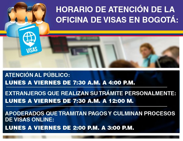 Señor usuario, tenga en cuenta que en diciembre la oficina de visas en Bogotá atiende en el horario habitual.pic.twitter.com/EOmCtrRKla