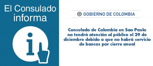 #ColombianosEnSaoPaulo El Consulado de Colombia en Sao Paulo no tendrá atención al público el 29 de diciembre debido a que no habrá servicio de bancos por cierre anual http://saopaulo.consulado.gov.co/newsroom/news/2017-12-27/15591 … …pic.twitter.com/LPnJc29PLo