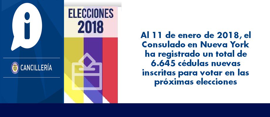 Al 11 de enero de 2018, el Consulado en Nueva York ha registrado un total de 6.645 cédulas nuevas inscritas para votar en las próximas elecciones http://nuevayork.consulado.gov.co/newsroom/news/2018-01-09/15655 …pic.twitter.com/zJSfWzyYA7