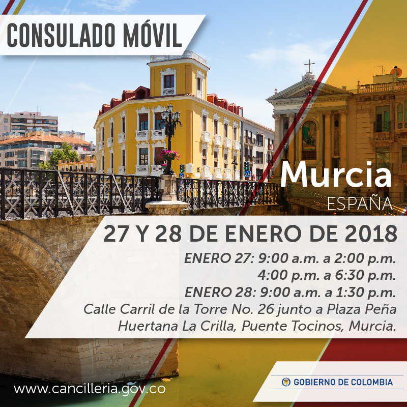 #Atención Colombianos en #MurciaEspaña se habilita jornada de Consulado Móvil para realizar trámites este 27 y 28 de enero #CancilleriaParaTodospic.twitter.com/U0gj4gvvQr