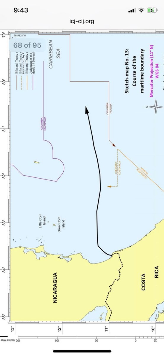 Entonces lo que debe hacerse es presentar un recuso para que no nos afecten los nuevos límites como lo muestra el mapa y defender los tratados con Costa Rica y Panamá que la Corte considera que no son vinculantes en el artículo 134 del fallo.pic.twitter.com/0lZ4irs60b