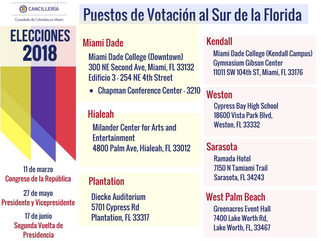 #Atención #ColombianosEnMiami El Consulado de Colombia publica los puestos de votación en Miami para las elecciones de 2018. http://miami.consulado.gov.co/newsroom/news/2017-12-26/15586 …pic.twitter.com/heuY9oxUC0