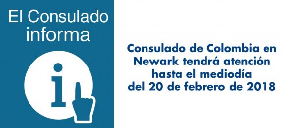 #ColombianosEnNewark Consulado de Colombia en Newark tendrá atención hasta el mediodía del 20 de febrero de 2018. http://newark.consulado.gov.co/newsroom/news/2018-02-16/15883 …pic.twitter.com/fgB4JjX95G