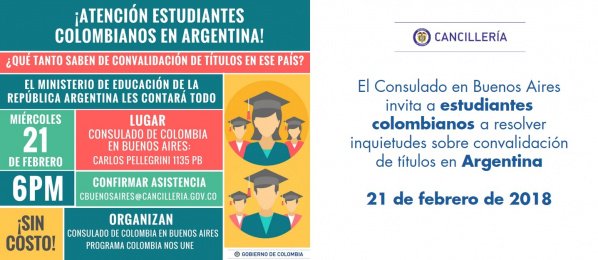 #ColombianosEnBuenosAires El Consulado en Buenos Aires invita a estudiantes colombianos a resolver inquietudes sobre convalidación de títulos en Argentina, el 21 de febrero de 2018. http://buenosaires.consulado.gov.co/node/news/15846/consulado-buenos-aires-invita-estudiantes-colombianos-resolver-inquietudes-sobre …pic.twitter.com/hKIsBkL0ul