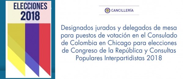 #ColombianosEnChicago Designados jurados y delegados de mesa para puestos de votación en el Consulado de Colombia en Chicago para elecciones de Congreso de la República y Consultas Populares Interpartidistas 2018. http://chicago.consulado.gov.co/node/news/15933/designados-jurados-y-delegados-mesa-puestos-votacion-consulado-colombia-chicago …pic.twitter.com/WzPnPMLqNn