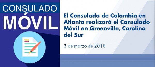 #ColombianosEnAtlanta #ColombianosEnGreenville El Consulado de Colombia en Atlanta realizará el Consulado Móvil en Greenville, Carolina del Sur el 3 de marzo. http://atlanta.consulado.gov.co/newsroom/news/2018-02-27/15963 …pic.twitter.com/TqScSACelr