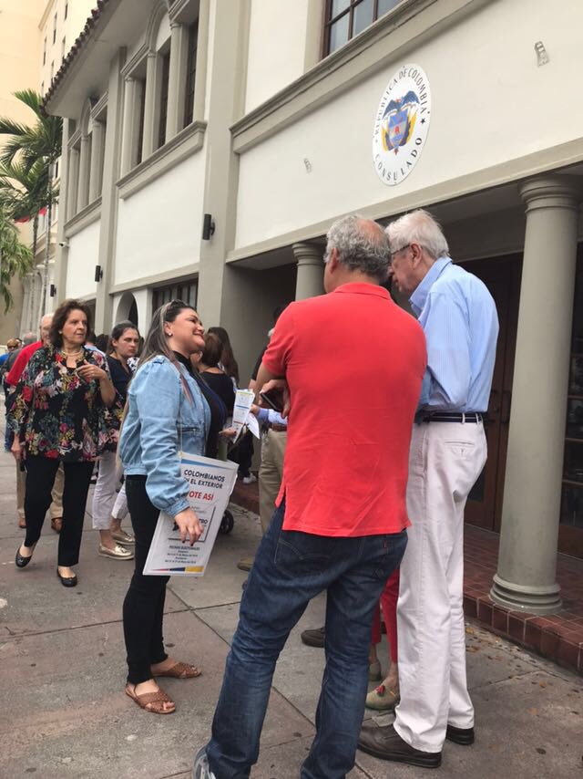 Personas del @CeDemocratico a portas del @CancilleriaCol de #Miami repartiendo publicidad a los votantes en las filas. Actividad que no se puede hacer a menos de 50 metros del puesto de votación. #EleccionesColombia2018 @UrielColombia @Registraduria @Caracol1260 pic.twitter.com/YGbaaA1qbb