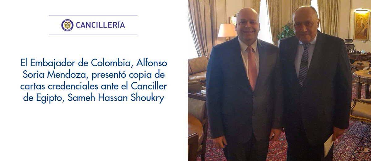 El Embajador de Colombia, Alfonso Soria Mendoza, presentó copia de cartas credenciales ante el Canciller de Egipto, Sameh Hassan Shouk http://www.cancilleria.gov.co/node/18649 pic.twitter.com/TCgY3vdjTi