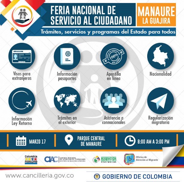 El próximo 17 de marzo estaremos en #Manaure brindando información sobre los siguientes tramites #CancilleriaEnLaGuajirapic.twitter.com/wiPTEEZ8lG