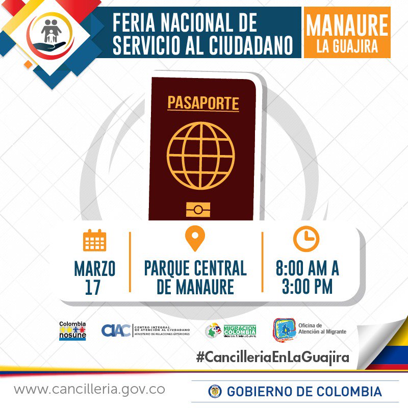 Adelante el trámite de su pasaporte este 17 de marzo en feria de servicios en #Manaure trabajaremos de la mano con @LAGUAJIRAGOBpic.twitter.com/CEzLe95RWr