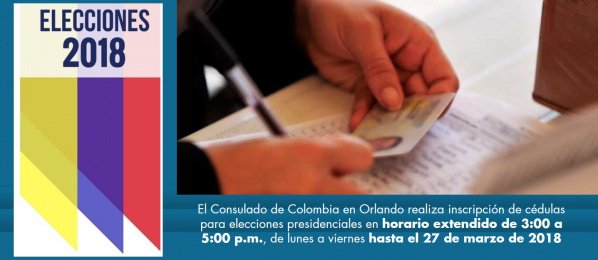 El Consulado de Colombia en Orlando realiza inscripción de cédulas para elecciones presidenciales en horario extendido de 3:00 a 5:00 p.m., de lunes a viernes hasta el 27 de marzo de 2018. #YoVotoEnElExterior #ColombianosEnOrlando http://orlando.consulado.gov.co/node/news/16275/consulado-colombia-orlando-realiza-inscripcion-cedulas-elecciones-presidenciales …pic.twitter.com/gN32dTYhom