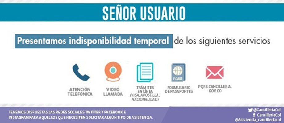 Respetado, todos nuestros servicios se encuentran reestablecidos. Consulte más información en:http://www.cancilleria.gov.co/newsroom/news/servicios-cancilleria-consulados-linea-encuentran-restablecidos-operando-normalidad …
