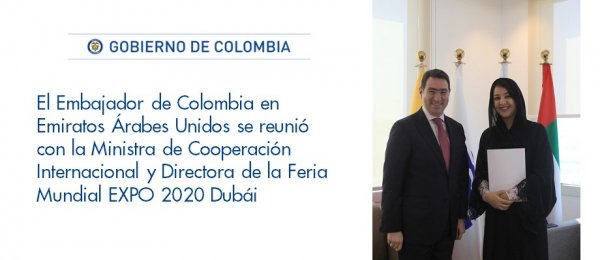 El Embajador de Colombia en Emiratos Árabes Unidos se reunió con la Ministra de Cooperación Internacional y Directora de la Feria Mundial EXPO 2020 Dubái. http://emiratosarabesunidos.embajada.gov.co/newsroom/news/2018-03-22/14133 …pic.twitter.com/CFaT3zZH0v