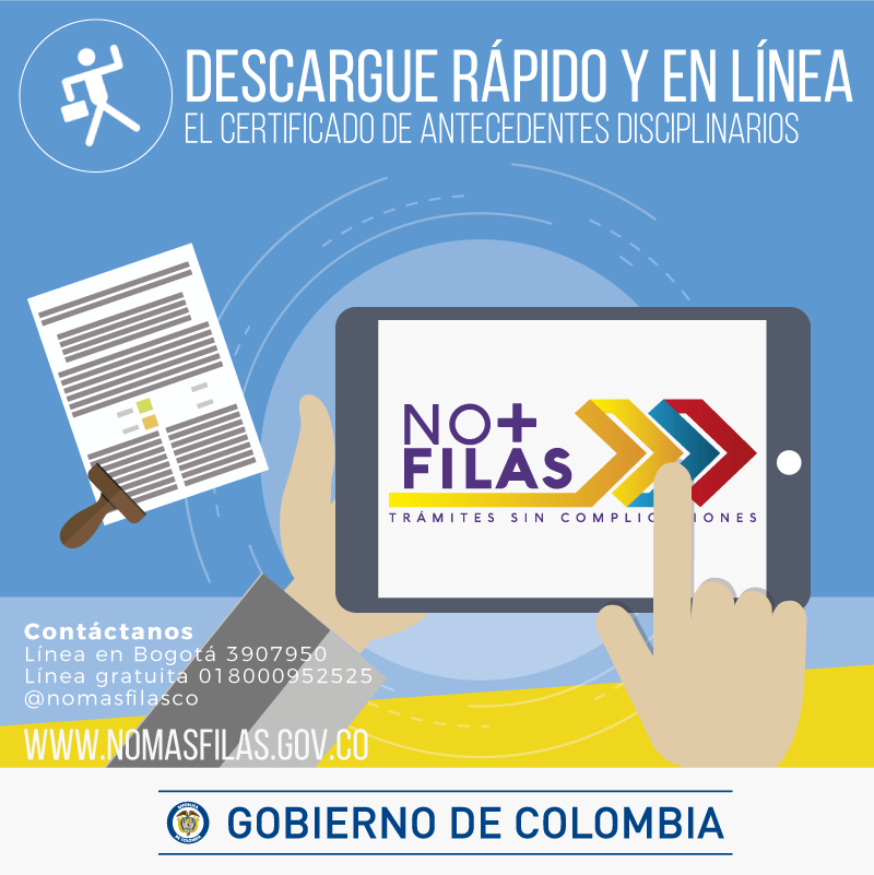 ¿Te pidieron el certificado de antecedentes disciplinarios? Descárgalo rápido en http://www.nomasfilas.gov.co . No Más Filas #TeDescomplicapic.twitter.com/52gMUt59vw