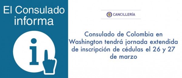 Consulado de Colombia en Washington tendrá jornada extendida de inscripción de cédulas el 26 y 27 de marzo. #ColombianosEnWashington #EleccionesColombia http://washington.consulado.gov.co/node/news/16359/consulado-colombia-washington-tendra-jornada-extendida-inscripcion-cedulas-26-y-27 … #ÚltimoDíapic.twitter.com/xnT0ox4Lvn