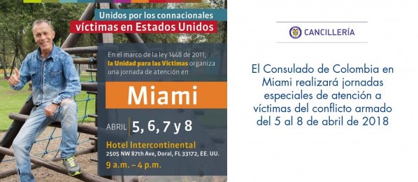 #ColombianosEnMiami El Consulado de Colombia en Miami realizará jornadas especiales de atención a víctimas del conflicto armado del 5 al 8 de abril de 2018. http://miami.consulado.gov.co/node/news/16390/consulado-colombia-miami-realizara-jornadas-especiales-atencion-victimas-del …pic.twitter.com/9EhbgVQxHF