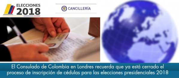 #EleccionesColombia El Consulado de Colombia en Londres recuerda que ya está cerrado el proceso de inscripción de cédulas para las elecciones presidenciales 2018. http://londres.consulado.gov.co/node/news/16417/consulado-colombia-londres-recuerda-que-ya-cerrado-proceso-inscripcion-cedulas-las …pic.twitter.com/BwjQ8FQJuz