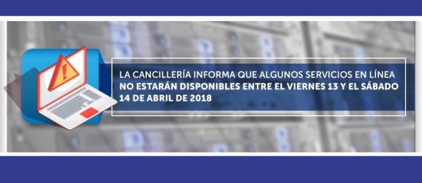 #Atención | La Cancillería informa que algunos servicios en línea no estarán disponibles entre el viernes 13 y el sábado 14 de abril de 2018. http://www.cancilleria.gov.co/newsroom/news/cancilleria-informa-algunos-servicios-linea-no-estaran-disponibles-viernes-13-sabado-0 …pic.twitter.com/Bam8dCGGo1