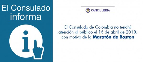 #Atención| #ColombianosEnBoston #Consulado de Colombia no tendrá atención al público el 16 de abril de 2018, con motivo de la Maratón de Boston. http://boston.consulado.gov.co/node/news/16477/consulado-colombia-no-tendra-atencion-al-publico-16-abril-2018-con-motivo-la-maraton …pic.twitter.com/PWY93fTp0Z