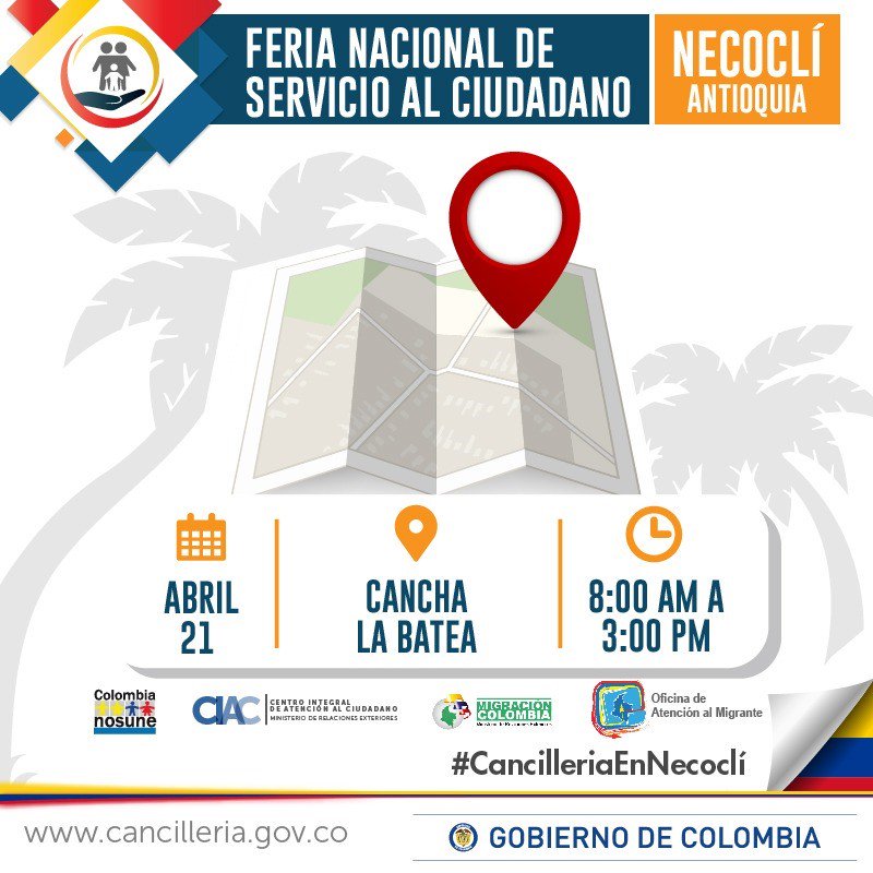 Ciudadano, participe en la Feria Nacional de Servicio al Ciudadano. Lo esperamos en la Cancha la Batea de #Necoclí reciba información sobre:pic.twitter.com/1BSCO5WeKM