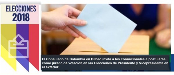 #Consulado de Colombia en Bilbao invita a los connacionales a postularse como jurado de votación en las Elecciones de Presidente y Vicepresidente en el exterior. #EleccionesColombia http://bilbao.consulado.gov.co/newsroom/news/2018-04-27/16586 … #ColombianosEnBilbaopic.twitter.com/Gs8cKEDLu6