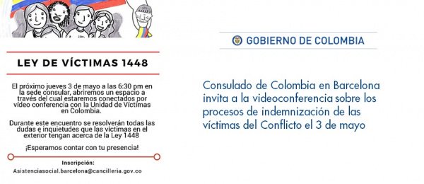 #Consulado de Colombia en Barcelona invita a la videoconferencia sobre los procesos de indemnización de las víctimas del Conflicto el 3 de mayo. http://barcelona.consulado.gov.co/newsroom/news/2018-05-02/16623 …pic.twitter.com/bQ5EjTGHAF