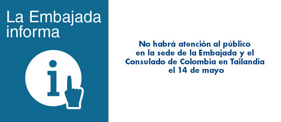 No habrá atención al público en la sede de la Embajada y el Consulado de Colombia en Tailandia el 14 de mayo http://tailandia.embajada.gov.co/newsroom/news/2018-05-09/14571 …pic.twitter.com/KynUxPeHH7