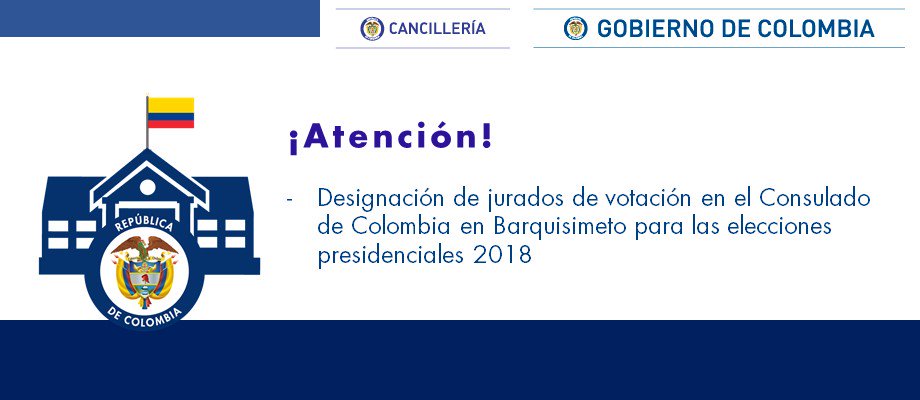 Designación de jurados de votación en el Consulado de Colombia en Barquisimeto para las elecciones presidenciales 2018 http://barquisimeto.consulado.gov.co/newsroom/news/2018-05-09/16687 …pic.twitter.com/NgwGHVtdCD