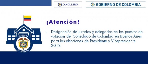 Designación de jurados y delegados en los puestos de votación del Consulado de Colombia en Buenos Aires para las elecciones de Presidente y Vicepresidente 2018. #EleccionesColombia #ColombianosEnBuenosAires http://buenosaires.consulado.gov.co/newsroom/news/2018-05-04/16652 …pic.twitter.com/suQUDjswsu