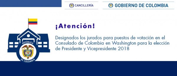 Designados los jurados para puestos de votación en el Consulado de Colombia en Washington para la elección de Presidente y Vicepresidente 2018. #EleccionesColombia #ColombianosEnWashington http://washington.consulado.gov.co/newsroom/news/2018-05-11/16732 …pic.twitter.com/WSerGWK2mN