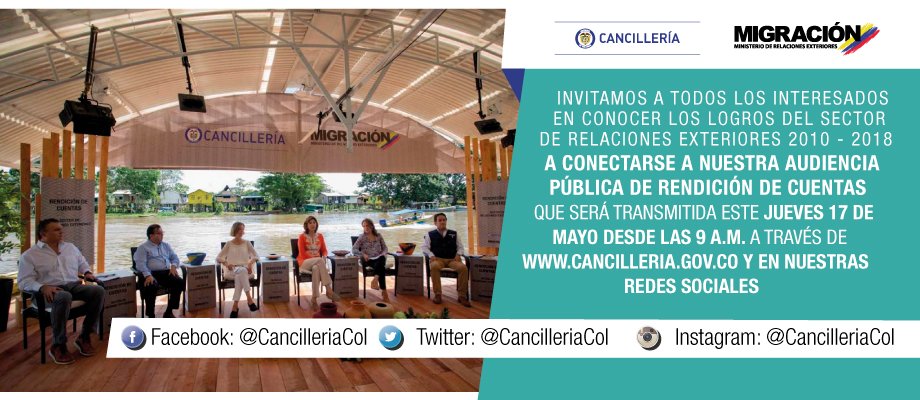 Hemos avanzado durante estos ocho años de Gobierno en muchos aspectos y queremos que los conozca. Conéctese este 17 de mayo a http://www.cancilleria.gov.co , a partir de las 9ª.m. a la Rendición de Cuentas de @CancilleriaColpic.twitter.com/pgs9vFPm2A