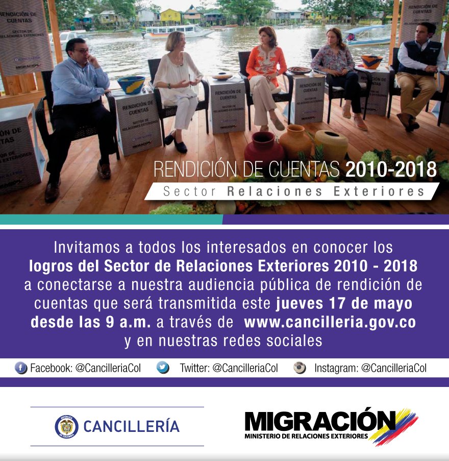 Conozca los logros de @CancilleriaCol durante estos ocho años de Gobierno. Siga la transmisión de Rendición de Cuentas a través de http://www.cancilleria.gov.co , este 17 de mayo a las 9 a.m. (hora COL)pic.twitter.com/h6tjmEi5SU