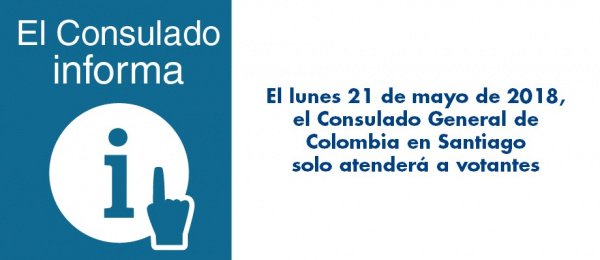 El lunes 21 de mayo de 2018, el Consulado General de Colombia en Santiago solo atenderá a votantes. #ColombianosEnSantiago http://santiagodechile.consulado.gov.co/newsroom/news/2018-05-16/16806 …pic.twitter.com/iP75AiZi5d
