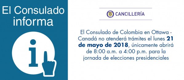 #Consulado de Colombia en Ottawa - Canadá no atenderá trámites el lunes 21 de mayo de 2018, únicamente abrirá de 8:00 a.m. a 4:00 p.m. para la jornada de elecciones presidenciales. #EleccionesColombia #ColombianosEnOttawa http://ottawa.consulado.gov.co/node/news/16837/consulado-colombia-ottawa-canada-no-atendera-tramites-lunes-21-mayo-2018-unicamente …pic.twitter.com/VyAYWlNJxU