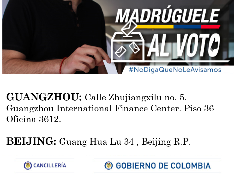 [AHORA] Apertura de mesas de votación en Guangzhou y Beijing para que los colombianos elijan al próximo Presidente de la República. Acérquese desde hoy hasta el 27 de mayo de 8am a 4pm a nuestros Consulados #MadrúgueleAlVotopic.twitter.com/oHHvvLP2h9