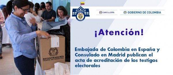Embajada de Colombia en España y Consulado en Madrid publican el acta de acreditación de los testigos electorales. #EleccionesColombia #ColombianosEnMadrid http://madrid.consulado.gov.co/newsroom/news/2018-05-21/16918 …pic.twitter.com/r9LNaNqQHl