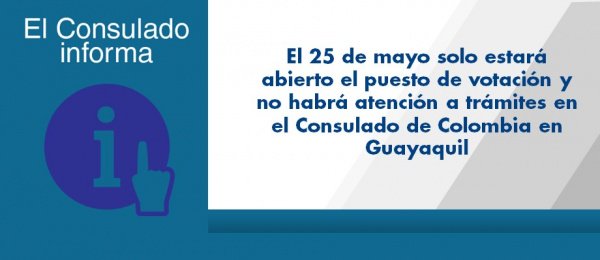 #Atención| El 25 de mayo solo estará abierto el puesto de votación y no habrá atención a trámites en el Consulado de Colombia en Guayaquil. #colombianosEnGuayaquil #EleccionesColombia http://guayaquil.consulado.gov.co/newsroom/news/2018-05-22/16973 …pic.twitter.com/nPufaPL23u