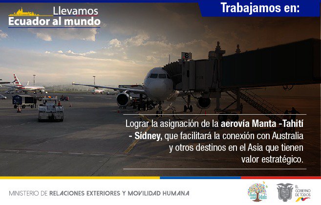 La asignación de la aerovía Manta - Tahití - Sídney facilitará la conexión con destinos en Asia. #LlevamosEcuadorAlMundopic.twitter.com/44sVmHPFYe