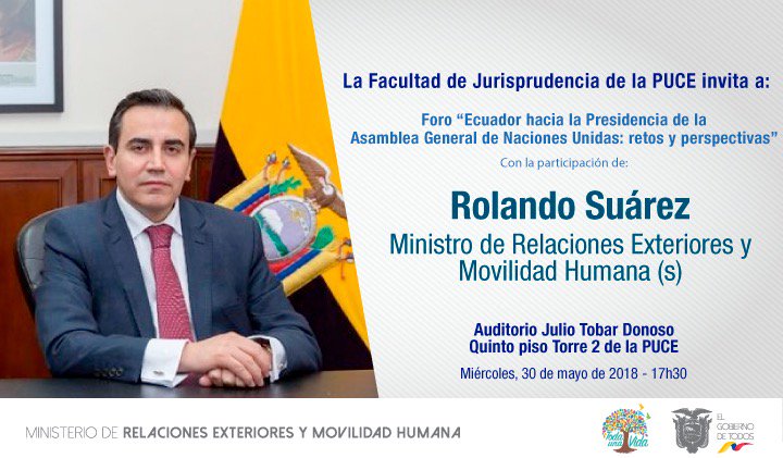 #Agenda | Canciller (s) @RSuarezEc participará en el foro "Ecuador hacia la presidencia de la Asamblea General de Naciones Unidas: Retos y perspectivas", este miércoles - 30 de mayo, 17h30, en @DerechoPUCE ¡Asiste! #EcuadorAlaONUpic.twitter.com/YdSot0SAAx
