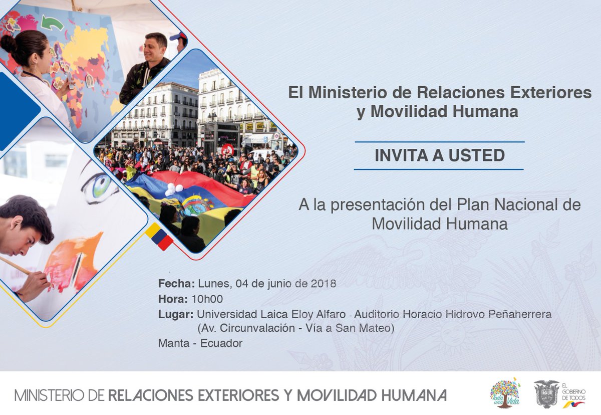 #Manta | @CancilleriaEc fortalece las políticas para los migrantes a través del nuevo #PlanMovilidadHumana. Asiste a su presentación hoy a las 10h00 en la Universidad Laica Eloy Alfaro. http://bit.ly/2srnIdu pic.twitter.com/UM48JbegpH
