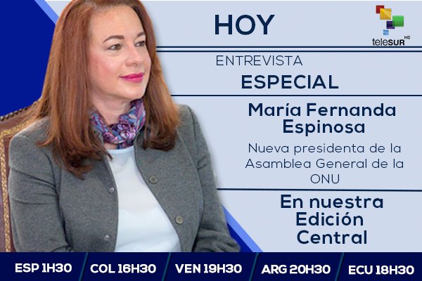 #Entrevista | Invitamos a seguir la entrevista a @mfespinosaEC, nueva presidenta de la ONU para dirigir el 73° período de sesiones. Hoy - 18h30 (Hora Ecuador) #EcuadorALaONUhttps://twitter.com/teleSURtv/status/1004038799368904704 …