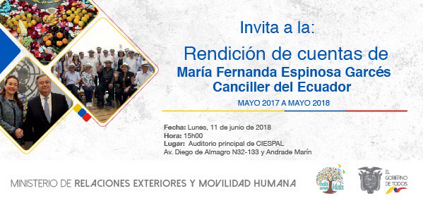 Lunes - 15h00 | Te invitamos a la Rendición de Cuentas de la Canciller @mfespinosaEC a realizarse en @ciespal .#LlevamosEcuadorAlMundopic.twitter.com/syxqcmb9rB