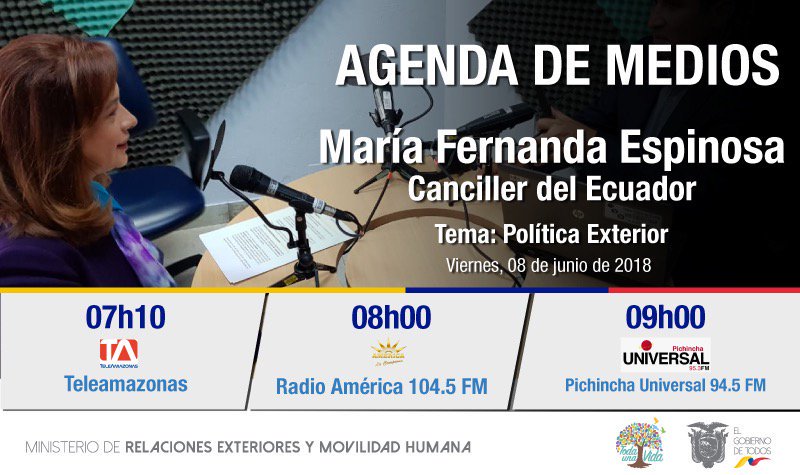 | La canciller @mfespinosaEC mantendrá entrevistas en @teleamazonasec, @RADIOAMERICAEC y @pichinchauniver este viernes, 08 de junio, sobre varios temas de la actual #PolíticaExteriorEc. ¡No te la pierdas!pic.twitter.com/EsKKhDuAL4