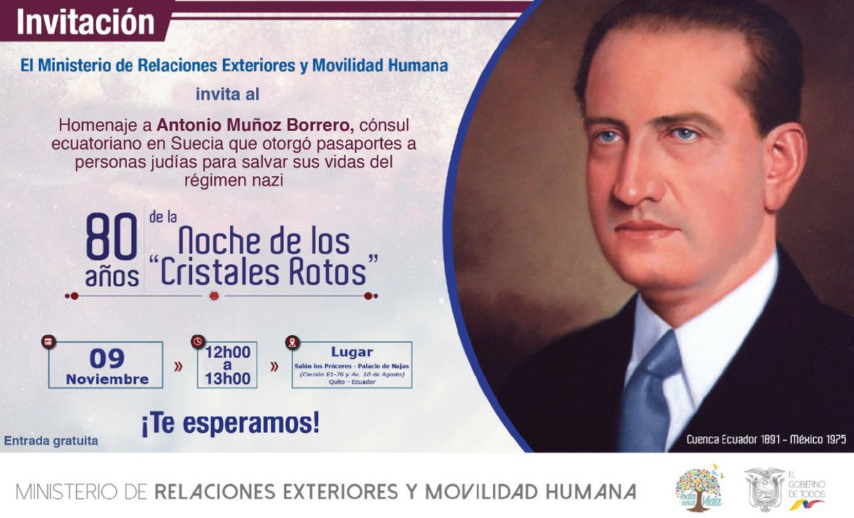 Viernes - 12h00 | La @CancilleriaEc te invita al homenaje a Antonio Muñoz Borrero, cónsul ecuatoriano, que salvó la vida de personas judías durante el régimen nazi. ¡Te esperamos!pic.twitter.com/LxzBSzYLTK