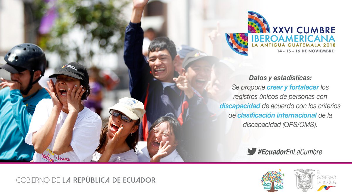 #26CumbreGT | En cuanto a la línea de acción que se refiere a estadísticas se consolidará un sistema de recopilación y gestión de datos sobre las personas con discapacidad, desagregados por sexo y edad, y demás variables para el diseño de políticas públicas. #EcuadorEnLaCumbrepic.twitter.com/KiENKV6fpA