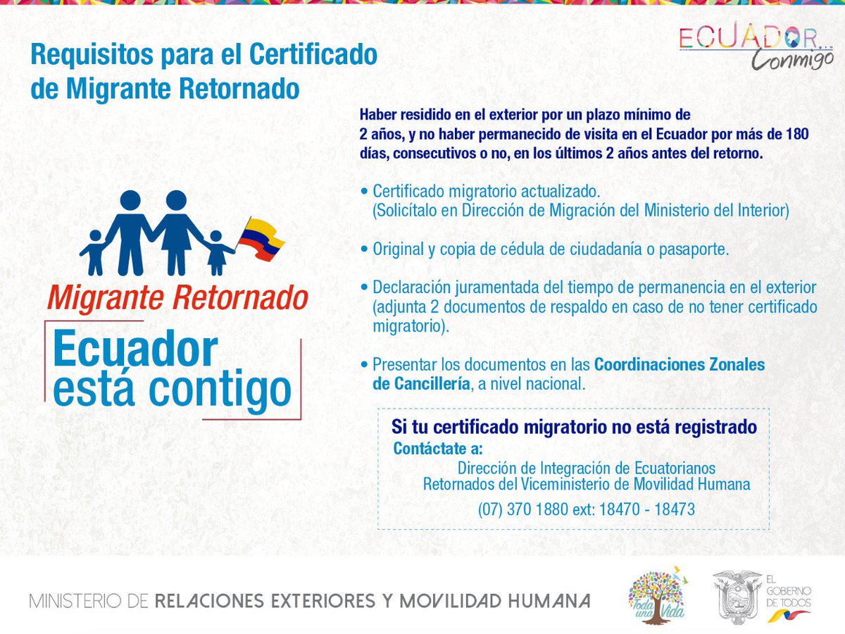 Ecuatoriano: si residiste en el exterior por un período mínimo de dos años conoce los requisitos para la obtención del Certificado de Migrante Retornado y realiza la solicitud en línea aquí: http://bit.ly/migranteretor #MigrantesRetornadosEcpic.twitter.com/VJBHcdPimn